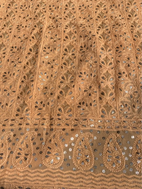 - Work: All-over fine Chikankari embroidery with gotapatti work