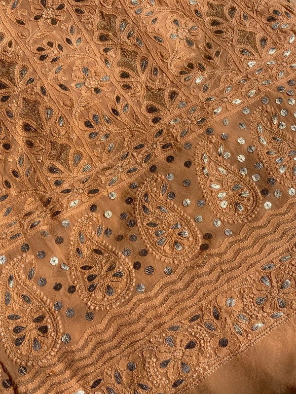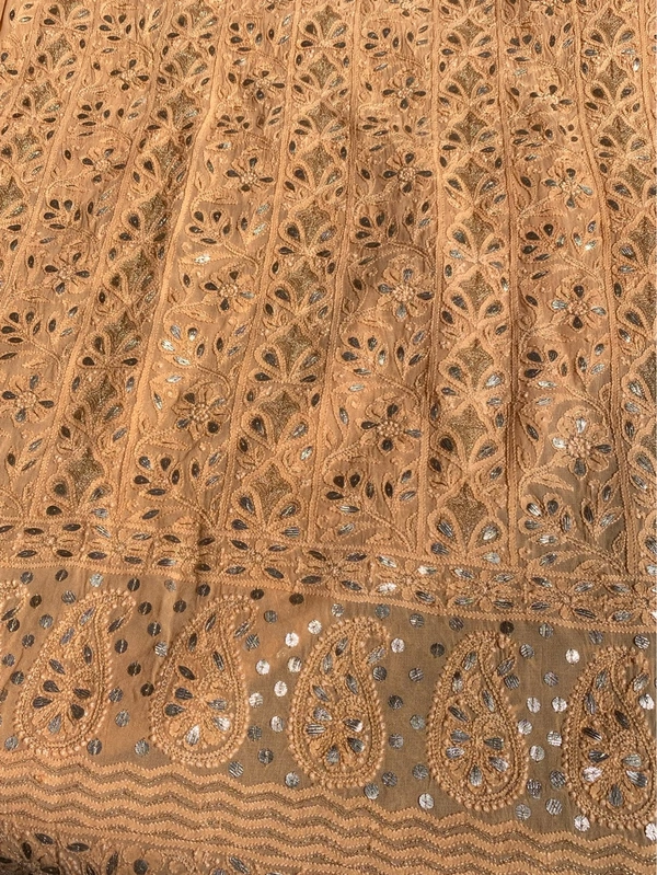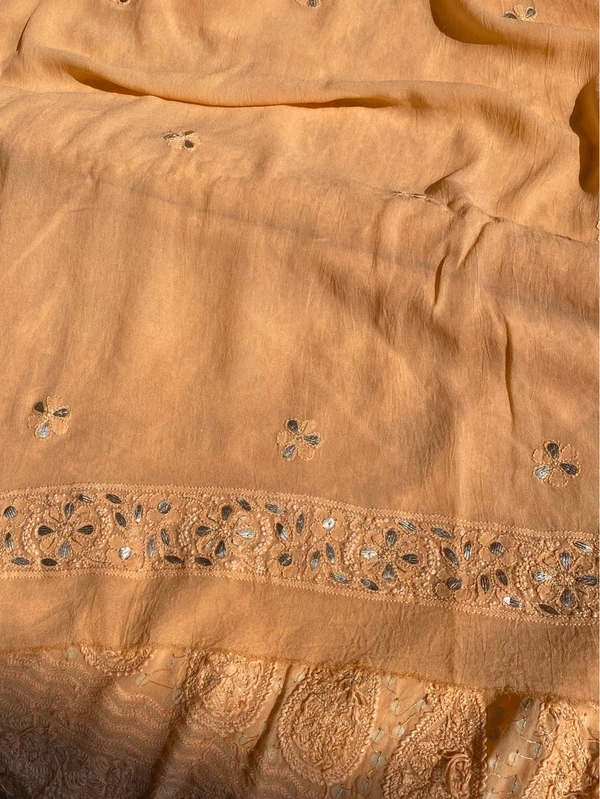Elevate your ethnic wardrobe with our exquisite Peach Chikankari unstitched kurta dupatta set, crafted on luxurious viscose georgette fabric. This stunning ensemble features all-over fine Chikankari embroidery, adorned with delicate gotapatti highlights.