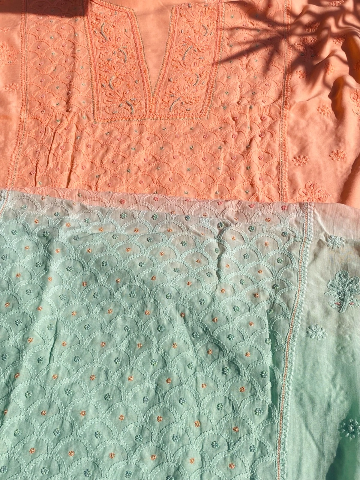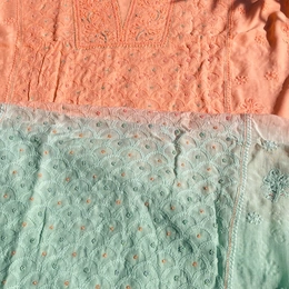 Elevate your spring wardrobe with our stunning unstitched Kurta & Dupatta set in soft Muslin fabric. This beautiful dual-tone piece features Peach and Light Green hues, adorned with intricate Chikankari work, Pearl Sequins, and Kasap. Perfect for day occasions, this lightweight and elegant ensemble is a must-have. Includes kurta and dupatta (no bottom). 🌟