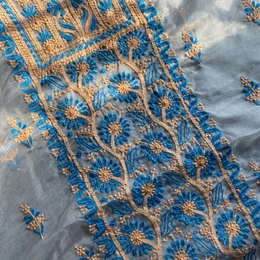 Elevate your ethnic style with our exquisite unstitched kurta and dupatta set in premium organza fabric. The off-white ensemble features beautiful chikankari embroidery with two-color tones of blue and beige. The dupatta boasts a stunning golden zari border, adding a touch of luxury. Perfect for weddings and special occasions, this set is a must-have in your wardrobe.