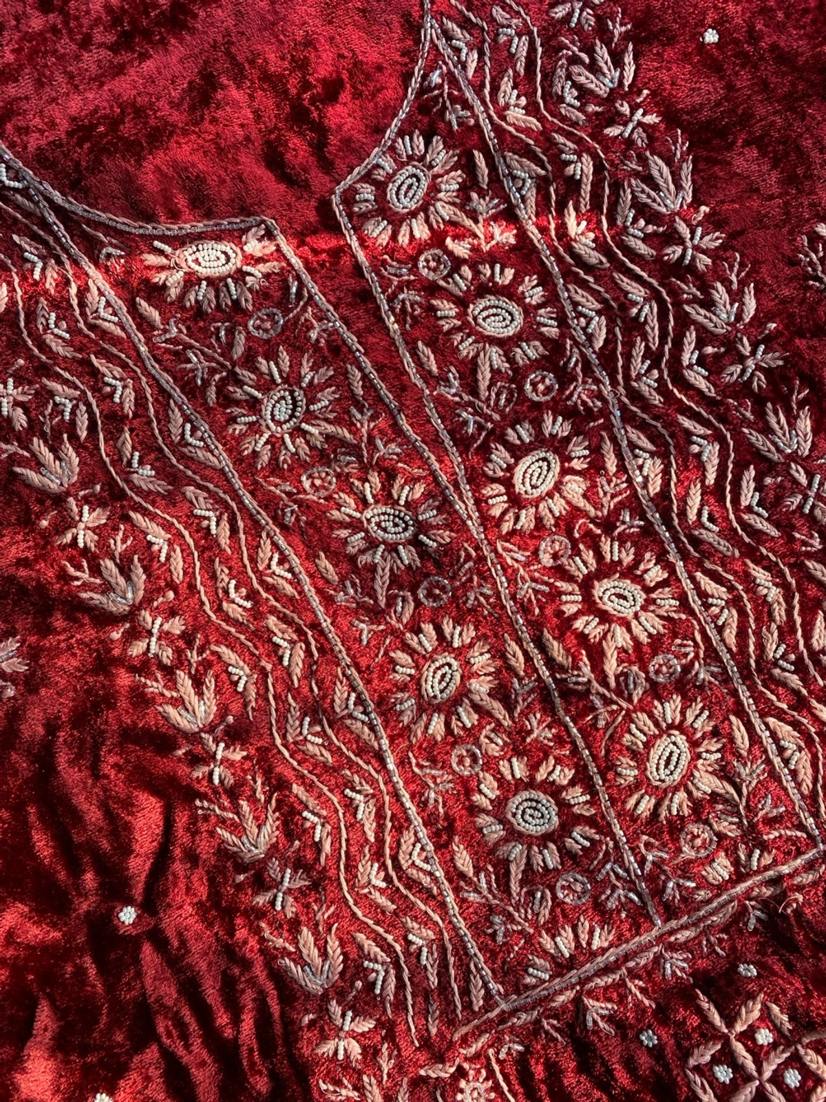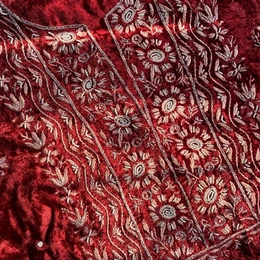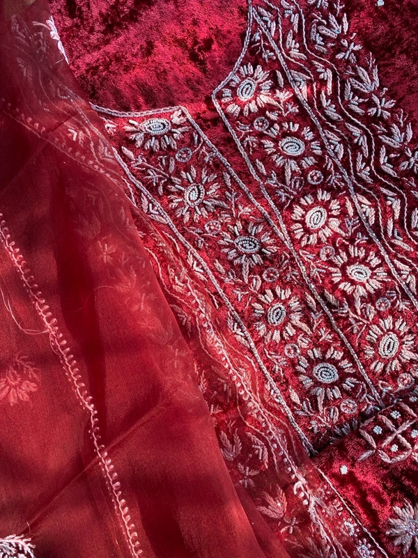 Crafted in premium Velvet kurta fabric and paired with Pure Organza dupatta, this maroon ensemble features intricate Chikankari embroidery in light pink, beautifully enhanced with pearl, beads, and sequins work.