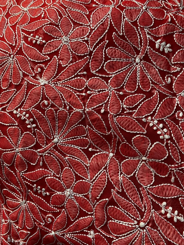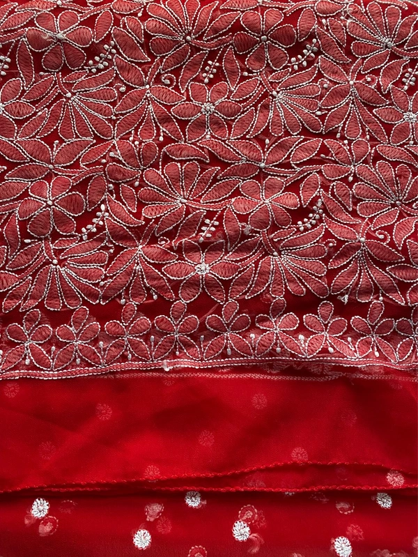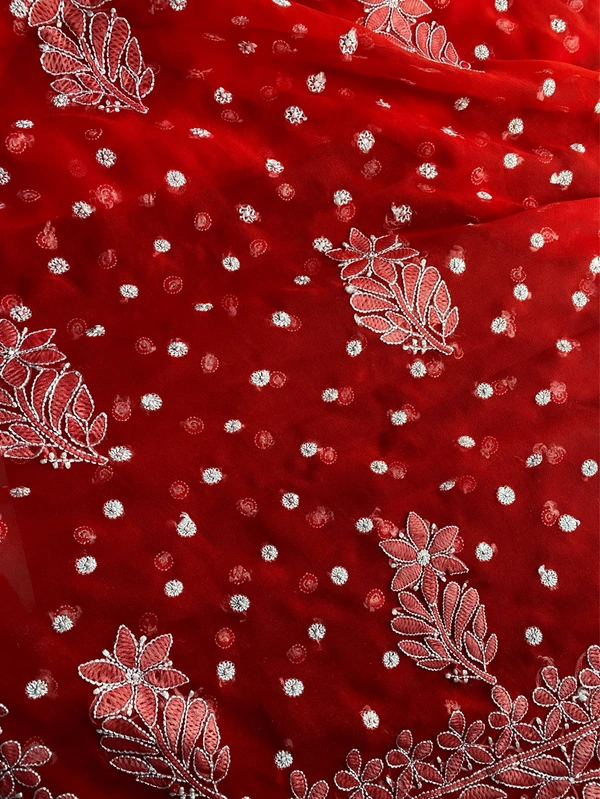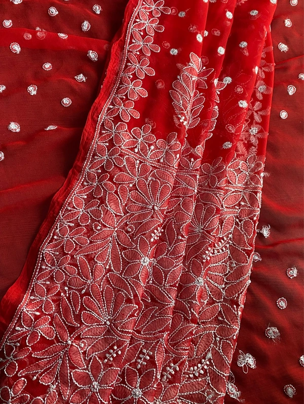 Make a bold yet graceful statement with this exquisite red Chikankari saree, beautifully crafted to reflect timeless Lucknowi artistry. Designed on soft and flowy faux georgette fabric, this saree offers both elegance and comfort, making it perfect for special occasions.