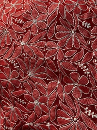 The saree features fine Chikankari hand embroidery done with white resham threads, creating a stunning contrast against the rich red base. The pallu is intricately detailed, adding depth and sophistication to the overall look. Enhanced with delicate kangan work spread gracefully all over the saree, it brings a touch of richness and traditional charm.