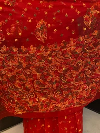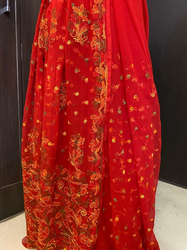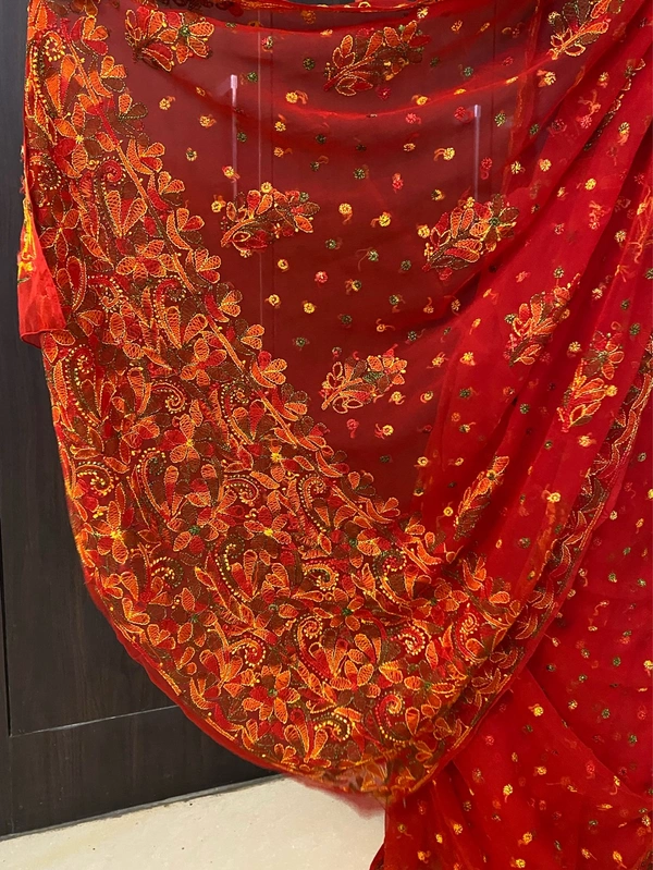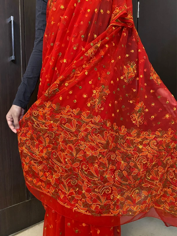 Red Multi Embroidered Chikankari Saree Full Kangan Work