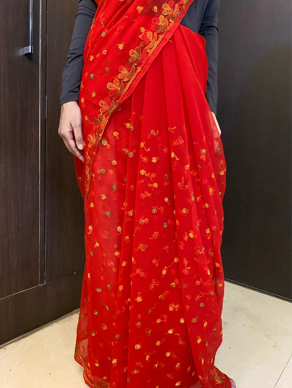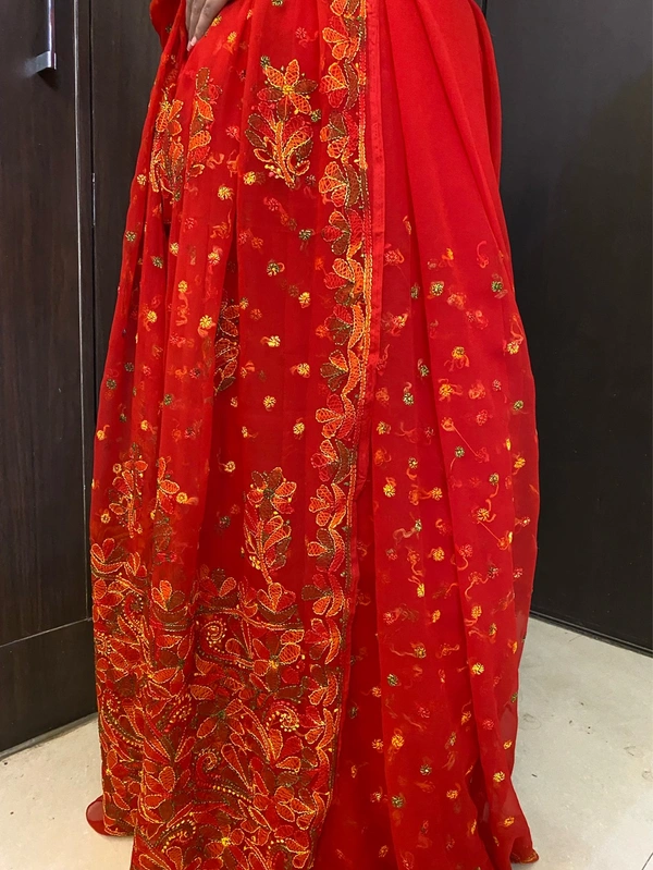 Make a bold yet graceful statement with this exquisite red Chikankari saree, beautifully crafted to reflect timeless Lucknowi artistry. Designed on soft and flowy faux georgette fabric, this saree offers both elegance and comfort, making it perfect for special occasions.