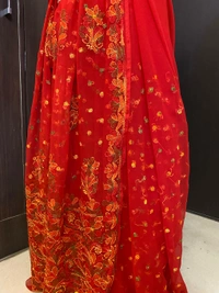 The saree features fine Chikankari hand embroidery done with multicoloured resham threads, creating a stunning contrast against the rich Red Colour base. The pallu is intricately detailed, adding depth and sophistication to the overall look. Enhanced with delicate kangan work spread gracefully all over the saree, it brings a touch of richness and traditional charm.