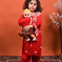 Red Reyon Chikankari Kids Dress