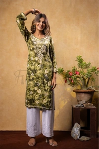 Reyon Gold Print Chikankari Straight Long Kurti- Mehndi Green