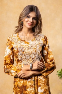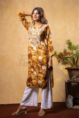 Reyon Gold Print Chikankari Straight Long Kurti- Mustard