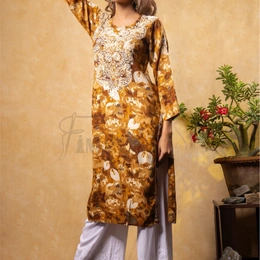 Reyon Gold Print Chikankari Straight Long Kurti- Mustard