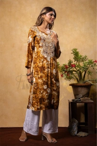 Reyon Gold Print Chikankari Straight Long Kurti- Mustard