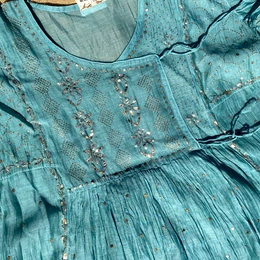 Firozi Semi-Stitched Angarkha Style Gown with Dupatta – Mul Fabric with Mukaish Pitta Work