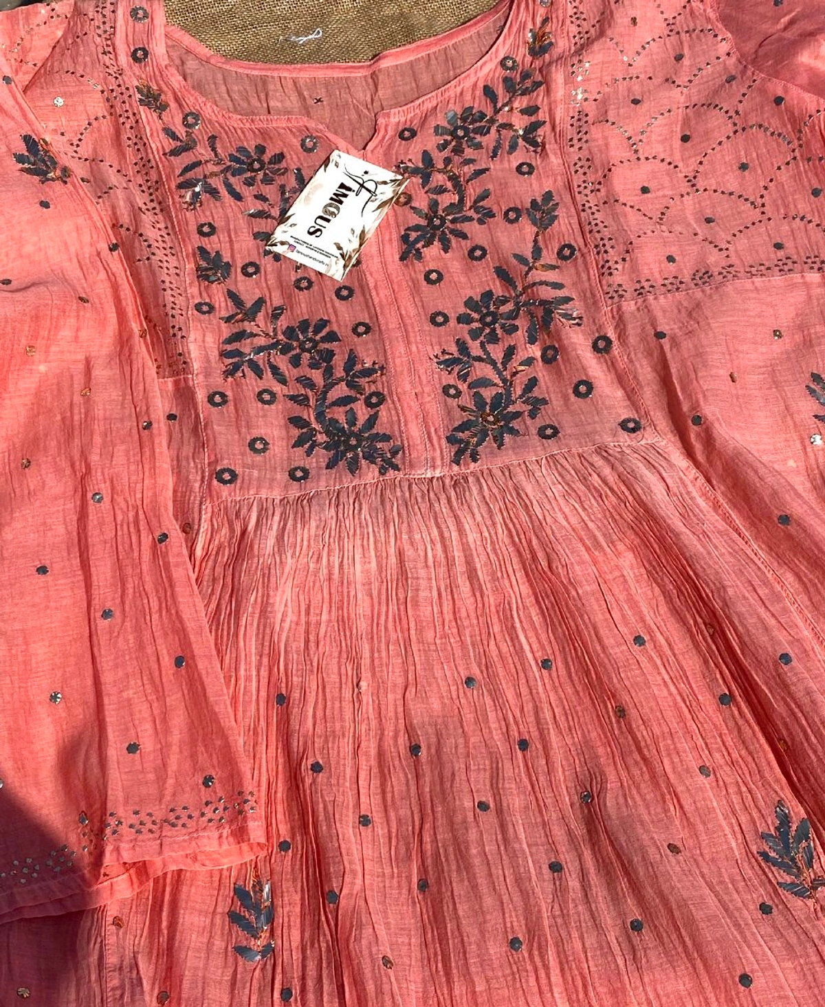Elevate your festive wardrobe with this stunning Mul Chanderi gown set in an elegant peach shade. Designed for Eid, weddings, and special occasions, this ensemble beautifully blends traditional craftsmanship with graceful modern styling.