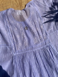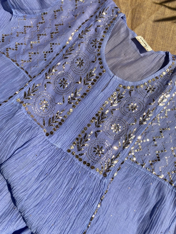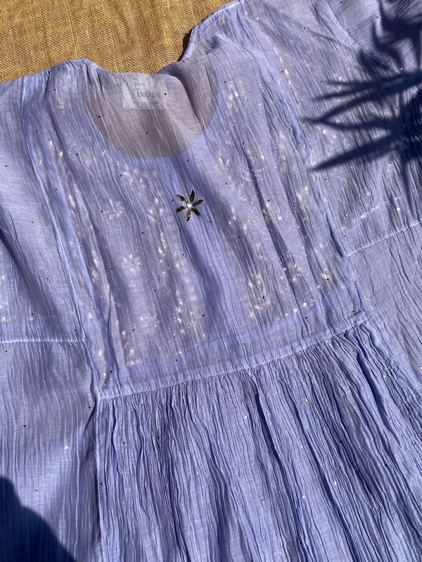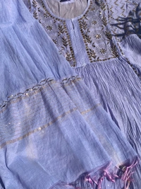 Elevate your festive wardrobe with this stunning Mul Chanderi gown set in an elegant purplish blue shade. Designed for Eid, weddings, and special occasions, this ensemble beautifully blends traditional craftsmanship with graceful modern styling.