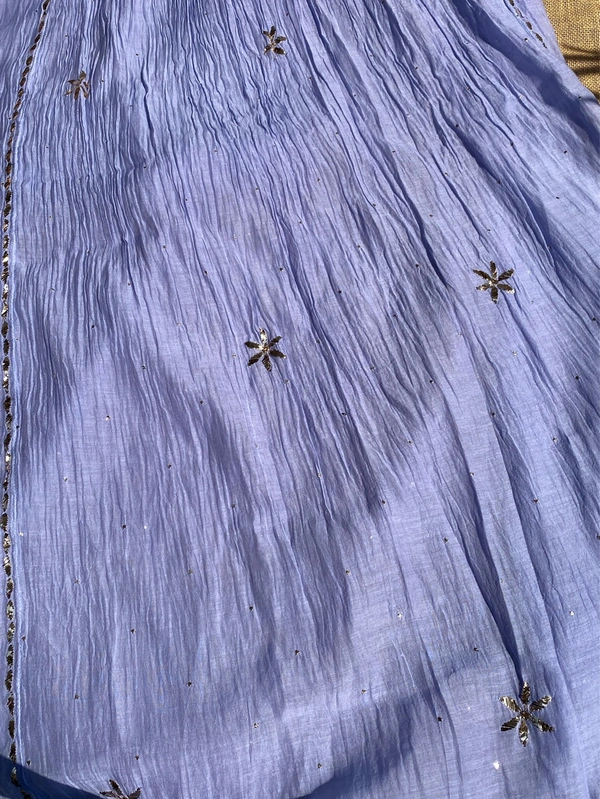 The semi-stitched gown is crafted from lightweight Mul Chanderi fabric, offering a soft, breathable, and flowy silhouette. Both the gown and dupatta are adorned with intricate handmade Mukaish and Pitta work, adding a subtle shimmer and royal charm to the outfit.