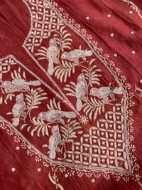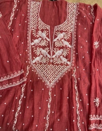 - Exquisite Embroidery: Intricate Chikankari embroidery covers the outfit, complemented by bird motifs on the neckline.
