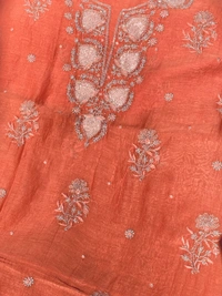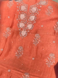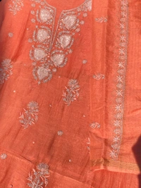 Add a touch of elegance to your festive and party wear wardrobe with stunning rust Chikankari unstitched kurta dupatta set, crafted on luxurious pure mul chanderi fabric. This exquisite ensemble features fine Chikankari embroidery, intricately adorned with pearl, sequins, and katdana work