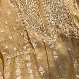 Step into the spotlight with unparalleled elegance and timeless charm. The Tussar Gold Chikankari Semi-Stitched Gown is a masterpiece that combines traditional craftsmanship with modern sophistication. Crafted from luxurious tissue fabric, this gown exudes grace and refinement, making it the ultimate choice for those unforgettable moments.