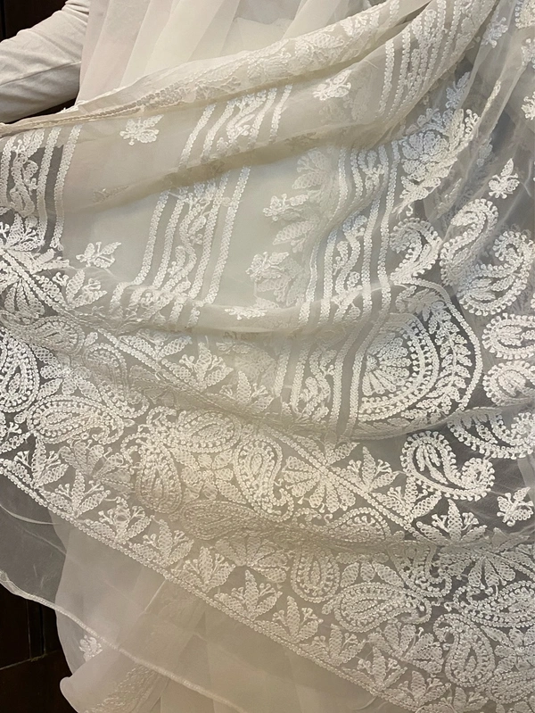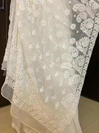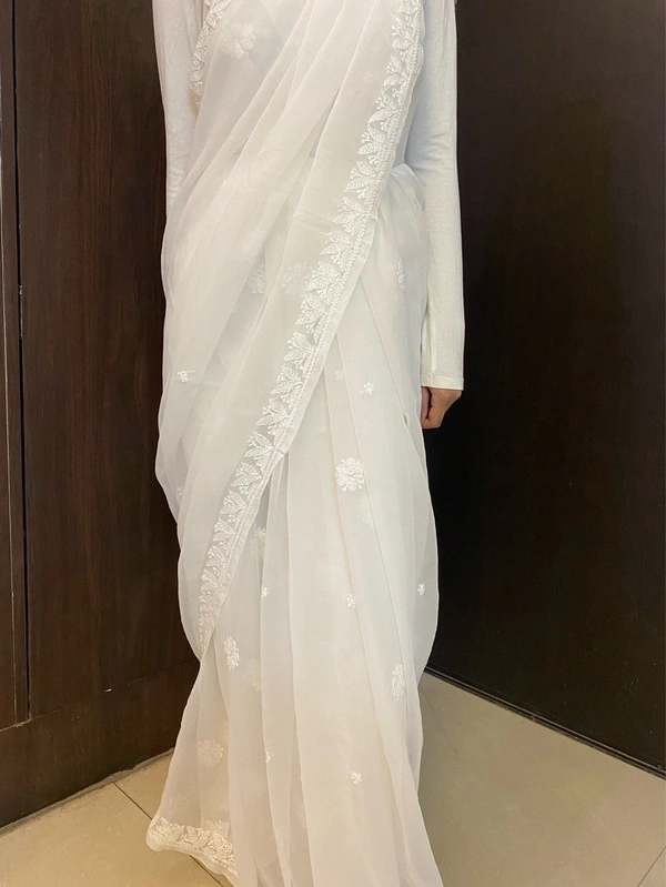 White Chikankari White Embroidered Saree