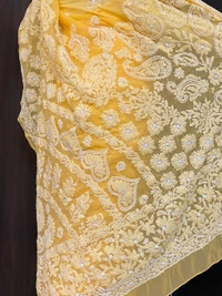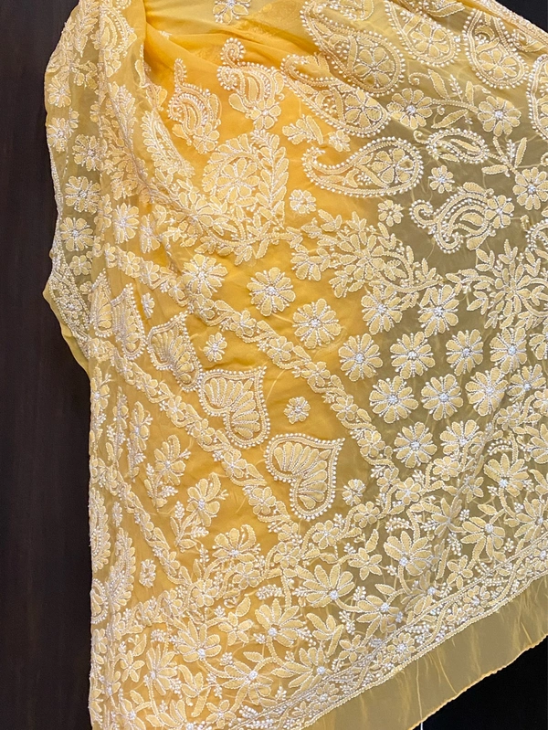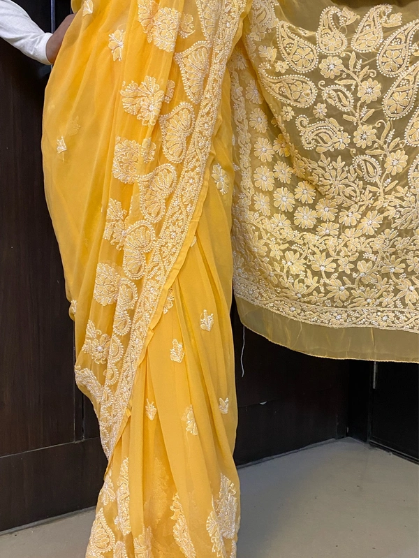 Radiate elegance in this beautifully crafted Chikankari saree in a refreshing yellow hue, designed to bring out timeless grace and sophistication. Made from lightweight Faux Georgette (60 grams), this saree drapes effortlessly, offering both comfort and style.