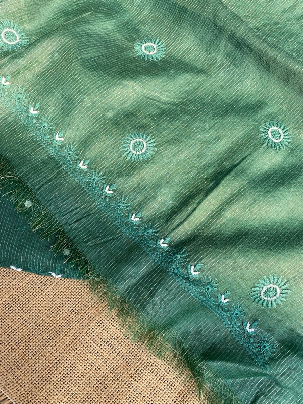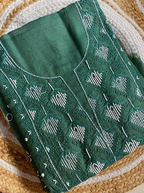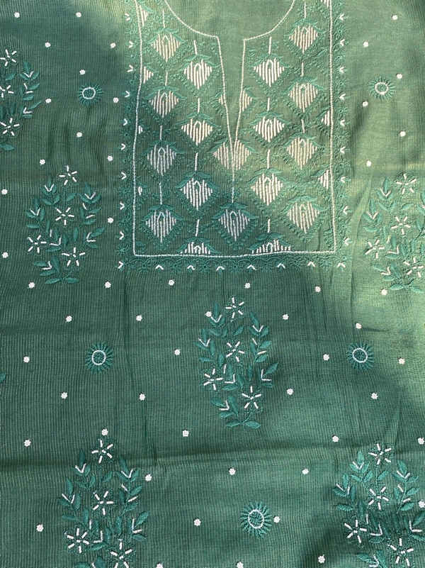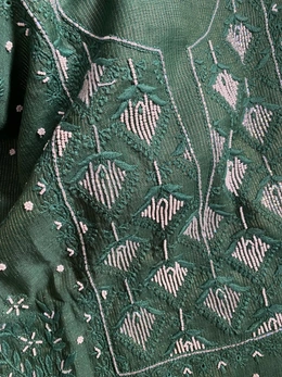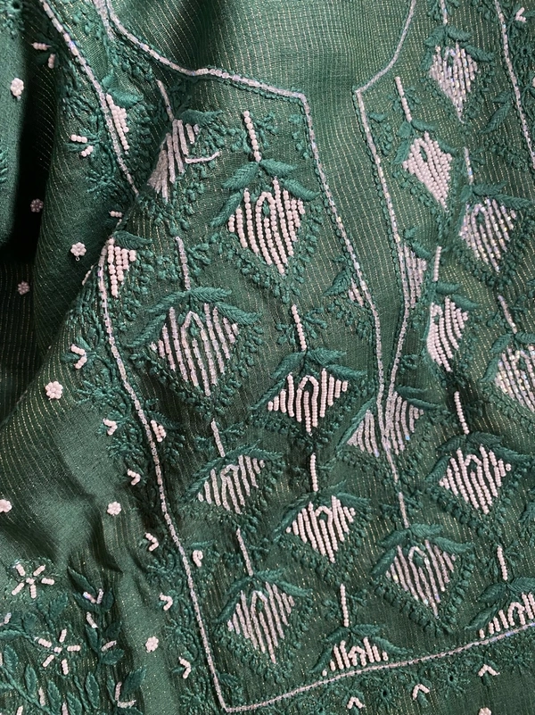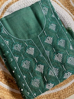 Elevate your wedding and special occasion wardrobe with our stunning bottle green Chikankari unstitched kurta dupatta set, crafted on luxurious Chanderi silk fabric. This exquisite ensemble features neat Chikankari embroidery, intricately adorned with white beads, pearls, and sequins.